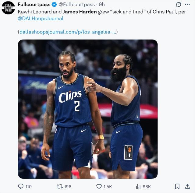 这场比赛的赛前快船队又传来了非常多的消息,伦纳德、哈登两人对克里斯-保罗已经厌恶透顶,一开始哈登就不赞成保罗的加盟。